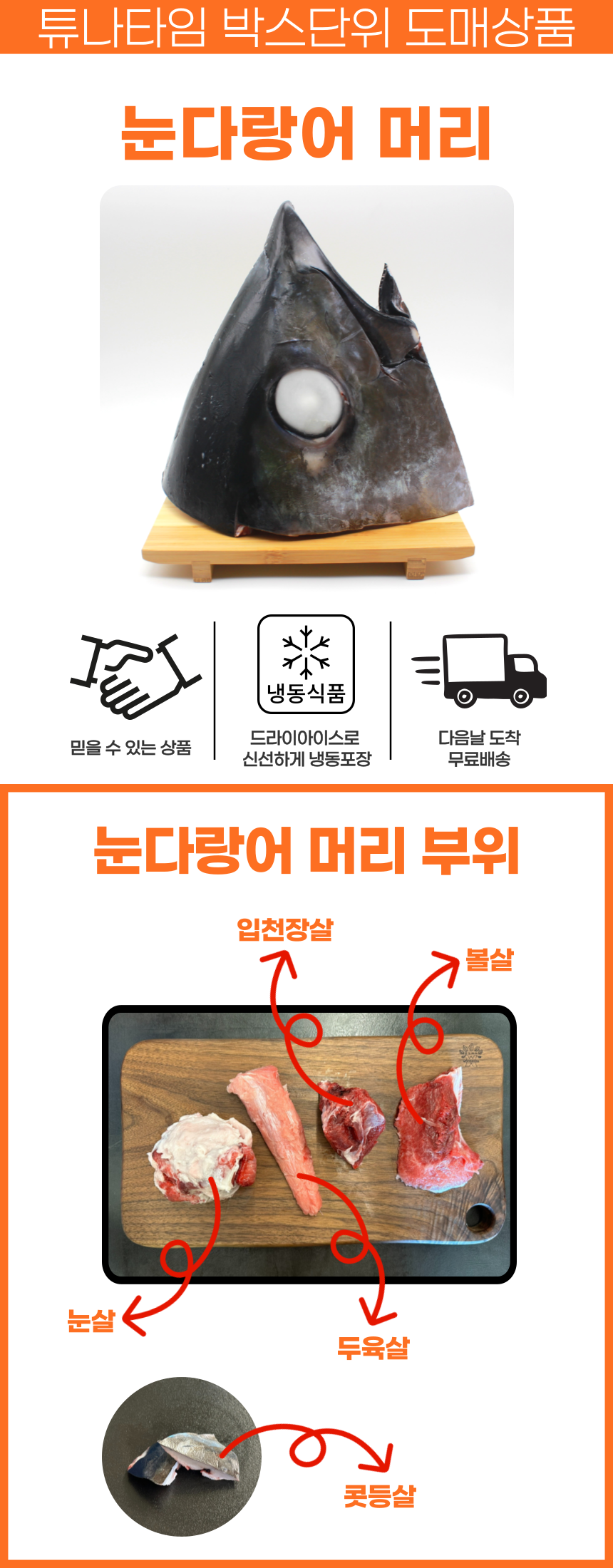 눈다랑어 머리는 볼살,두육살,눈살(수정체),입천장살,콧등살등의 부위를 얻을 수 있습니다.