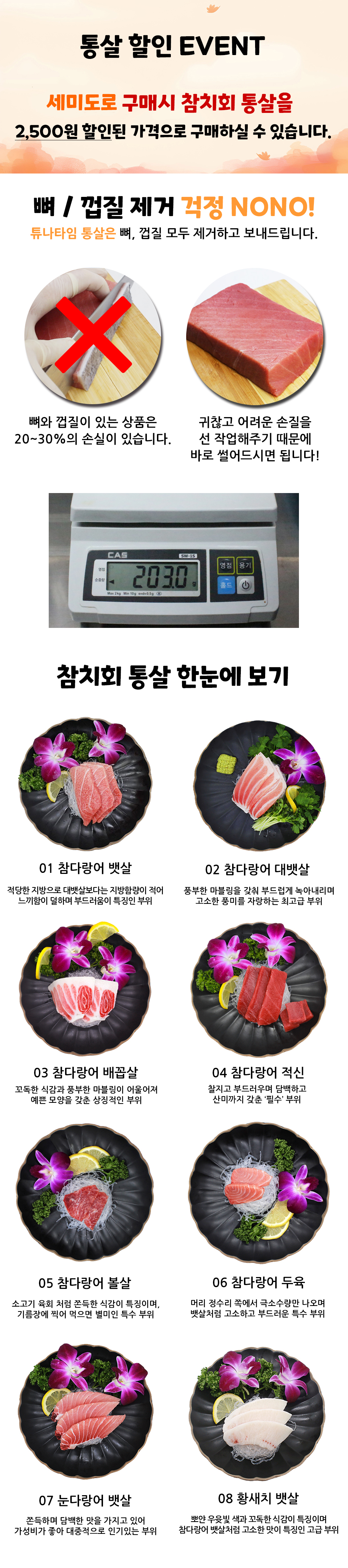 참다랑어 최고급 부위인 배꼽살과 대뱃살을 즐기실 수 있는 세미도로와
