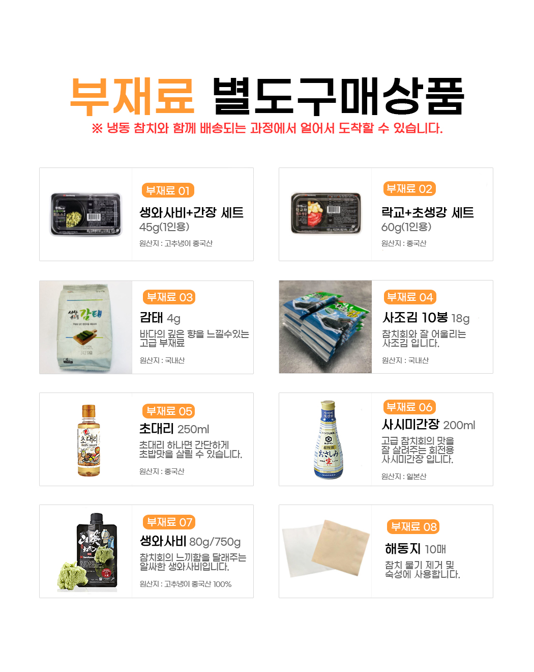 생와사비/사시미간장 등의 부재료는 취향에 맞게 추가 상품으로 구매해주세요.